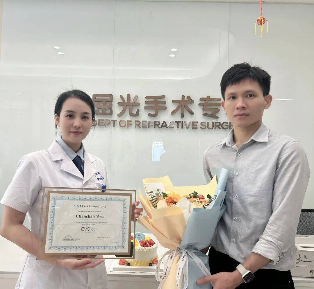 此次获评副高级职称,温婵婵主任现任来宾爱尔眼科医院屈光中心主任,同时担任爱尔眼科广西省区屈光学组委员会委员、来宾市医学会眼科专业委员会委员等学术职务。她是科室的技术与管理核心,持有国家准分子激光手术认证及瑞士EVO ICL晶体植入术全球认证,具备开展国际主流近视手术的完整资质。