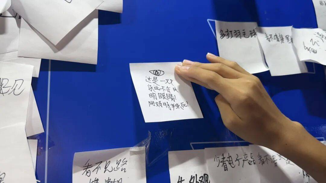 互动墙上贴着市民写下的视力烦恼,“十米之外人畜不分”、“吃火锅永远第一个瞎”…