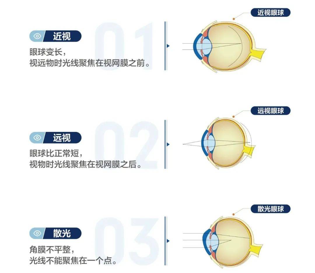 可一旦这中间发生变化,使平行光线不能准确聚焦于视网膜上,就会出现我们通常所说的屈光不正,即近视(一般指轴性近视)、远视、散光。