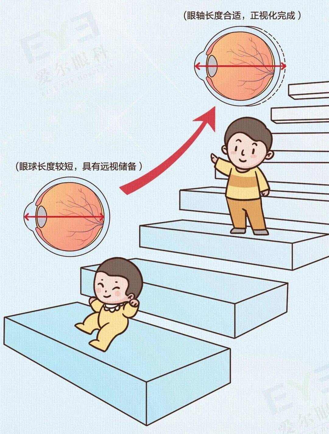 在我们刚出生的时候,眼轴通常较短,因此处于生理性远视阶段,并具备一定的远视度数储备。随着年龄的增长、身体的发育,眼球逐渐长大,眼轴会和身高一样逐渐增长,远视度数逐渐降低而趋于正视,这个过程称为“眼球的正视化”。