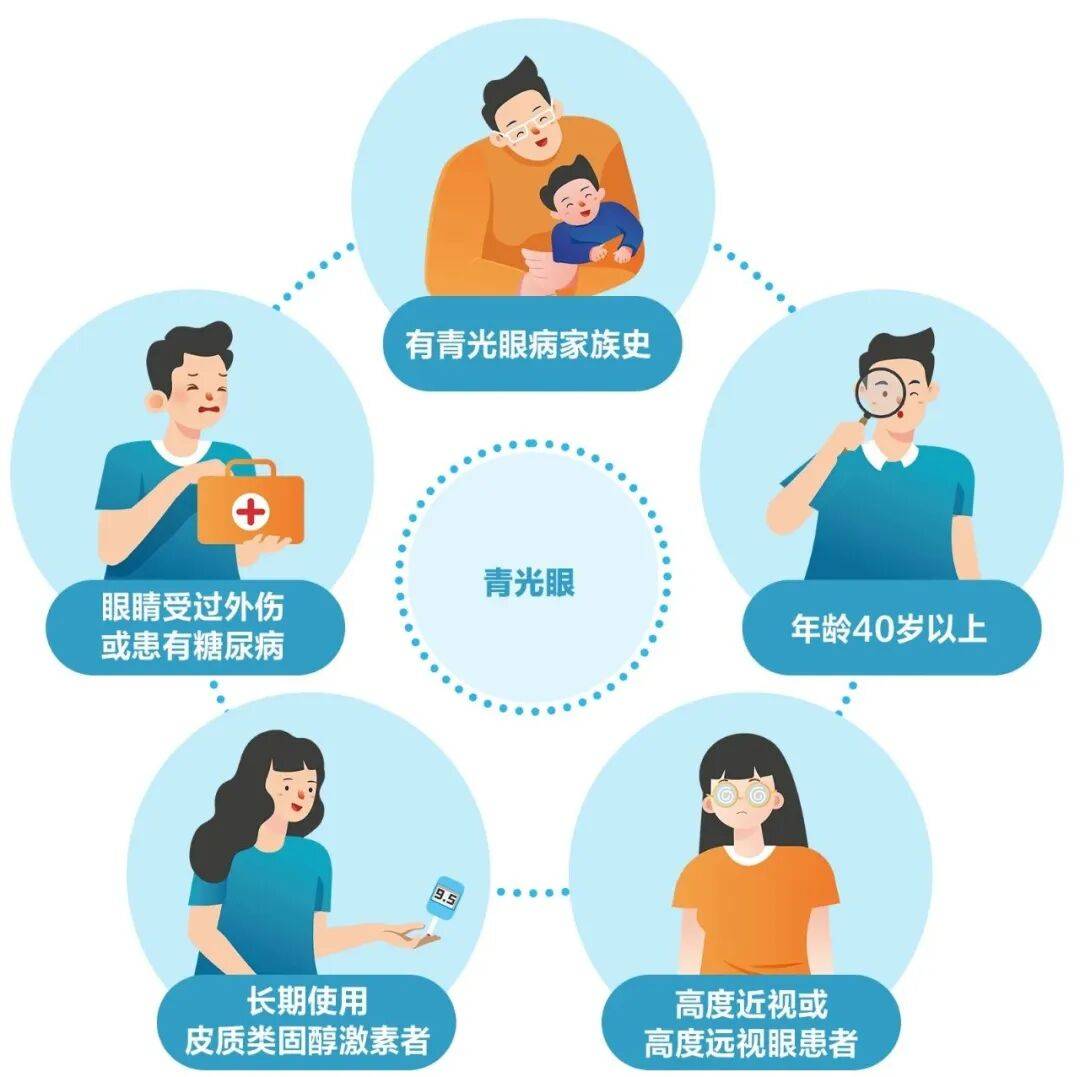 有青光眼家族史,年龄40岁以上,眼睛受过外伤或患有糖尿病,高度近视或高度远视,长期使用皮质类固醇激素者,均属于高发人群。